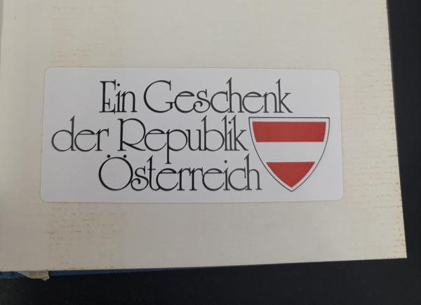 ドイツ語で 「Ein Geschenk der Republik Österreich」 と書かれており、これは 「オーストリア共和国からの贈り物」 という意味です。右側の赤と白の紋章は、オーストリアの国旗をモチーフにした盾形の紋章です。