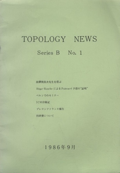 Topology News Series B No.1 故静間良次先生を偲ぶ/Rego-RourkeによるPoincare予想の”証明”/ベルンでのセミナー/ICM印象記他