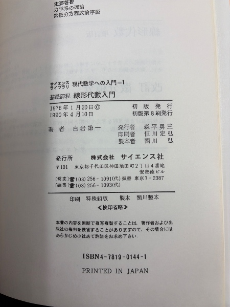 基礎課程線形代数入門 <サイエンスライブラリ現代数学への入門> 初版第8刷