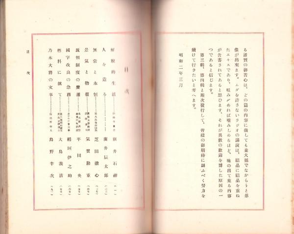 • 著者 日本放送協会東海支部編纂、〈新井石禪「解脱的生活」〉〈廣井辰太郎「人を造る」〉〈芝田徹心「無常と永恒」〉〈氣賀勘重「景気と物価」〉〈平田央「裁判制度の変遷」〉〈稲垣伊之助「国字改良の急務」〉〈大島義清「燃料に就て」〉〈鳥野幸次「乃木大将の文事」〉〈笹川臨風「不易と流行」〉〈長尾巧「過去の氷時時代」〉〈安倍季雄「母性の尊重」〉〈石田元季「国文学上に現はれたる女性」〉〈北原十三男「皺を取る話」〉