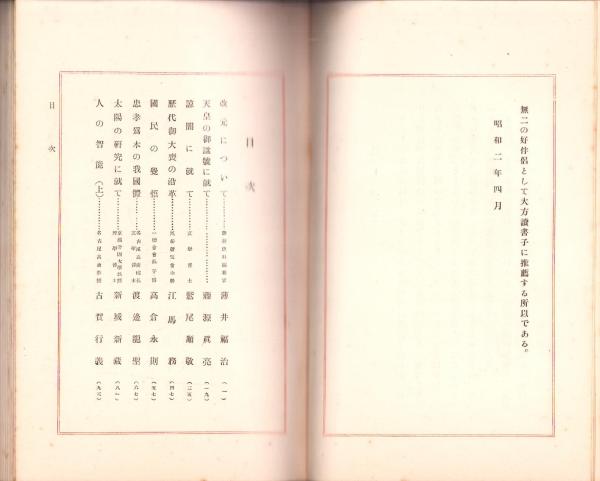 • 著者 日本放送協会東海支部編纂、〈薄井福治「改元について」〉〈藤源眞亮「天皇の御諡号に就て」〉〈鷲尾順敬「諒闇に就て」〉〈江馬務「歴代御大喪の沿革」〉〈高倉永則「国民の覚悟」〉〈渡邊龍聖「忠孝爲本の我国体」〉〈新城新藏「太陽の研究に就て」〉〈古賀行義「人の智能」〉〈平泉澄「歴史に現れたる異常の力」〉〈安藤秋三郎「家庭の空気に就て」〉〈嘉悦孝子「大正婦人の自覚」〉〈加藤正雄「人造絹糸の話」〉〈稲垣日省「囲碁」〉