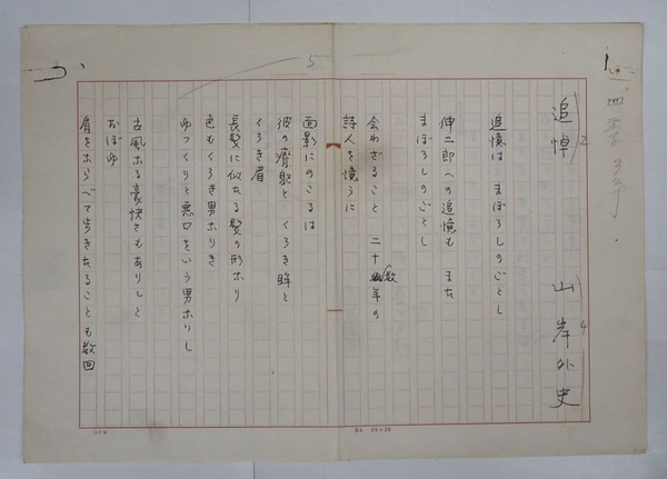 山岸外史詩稿 『追悼』(蔵原伸二郎追悼)ペン書四百字詰二枚完