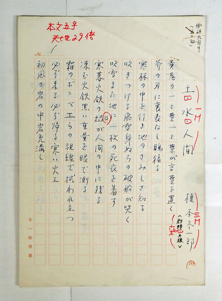 榎本冬一郎句稿 『土・水・人間』 ペン書50句二百字詰五枚完 欄外に「俳研九月号(五〇句)」と明記