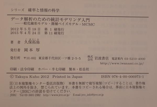 データ解析のための統計モデリング入門 : 一般化線形モデル・階層ベイズモデル・MCMC <確率と情報の科学 / 甘利俊一, 麻生英樹, 伊庭幸人 編> 第11刷