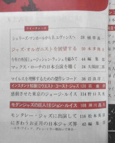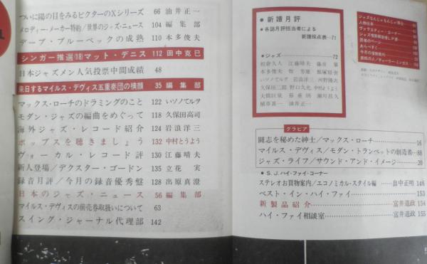 シェリーズ・マンホールからB.エヴァンスへ/植草甚一 ジャズ・オルガニストを展望する/本多俊夫 今年と外国ミュージッシャン・ラッシュを顧みて/編集部 マックス・ローチの日本公演を聴く/久保田二郎 マイルスを理解するための傑作レコード/岩浪洋三 感動させた東京のジョージ・ルイス 他