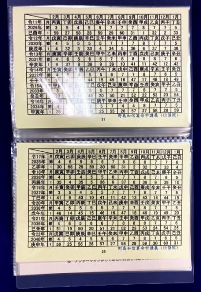 • 解説 新本 はがきサイズ 1873年(明治6年)~2040年(令和22年)までの暦・十干表・十二市表・六十干支表・天中殺表・月支早見表・干合表・十大主星早見表・十二大従星早見表・二十八元素・位相法など。