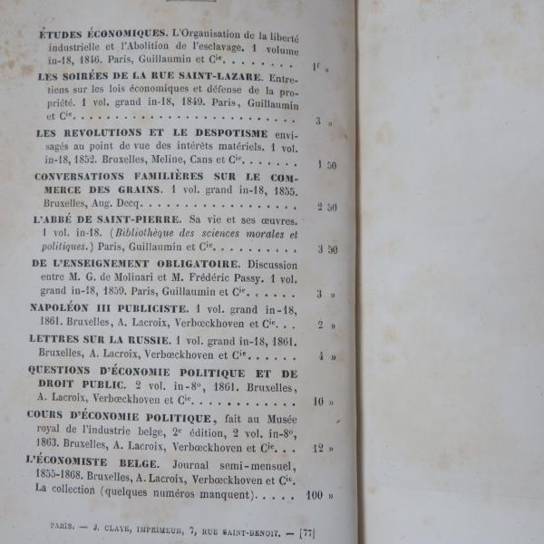 LES SOIRÉES DE LA RUE SAINT-LAZARE. Entre-tiens sur les lois économiques et défense de la pro-priété. 1 vol. grand in-18, 1849. Paris, Guillaumin et Cie..