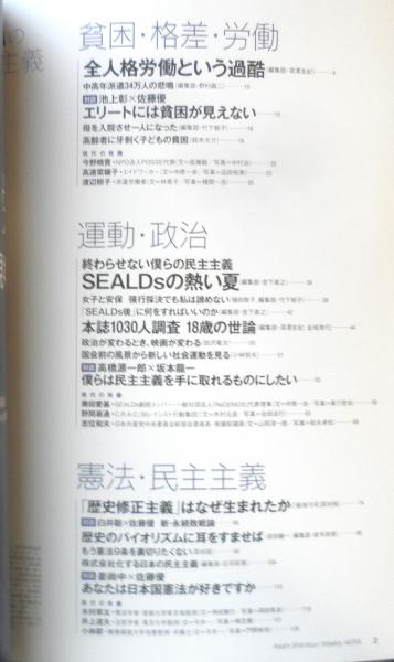 貧困・格差・労働 全人格労働という過酷 対談・池上彰×佐藤優 運動・政治 終わらせない僕らの民主主義/SEALDsの熱い夏 本誌1030人調査/18才の世論 対談・高橋源一郎×坂本龍一 憲法・民主主義 「歴史修正主義」はなぜ生まれたか 対談・白井聡×佐藤優 対談・姜尚中×佐藤優 他