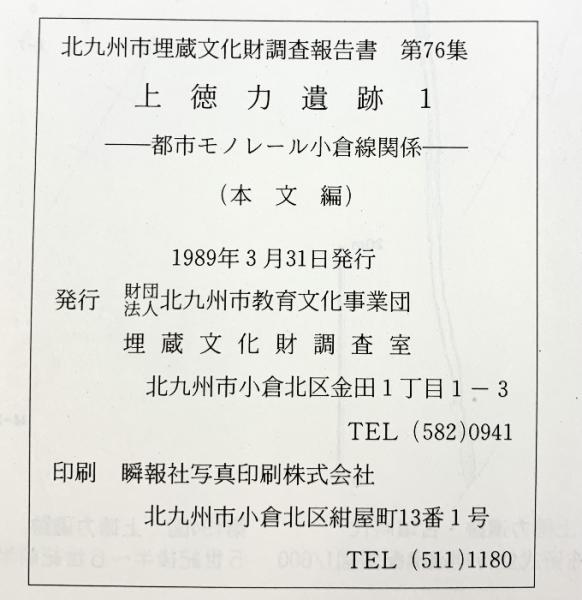 上徳力遺跡(1) (本文編+図版編/全2冊セット)(北九州市)都市モノレール小倉線関係 北九州市教育文化事業団 埋蔵文化財調査室 1989年