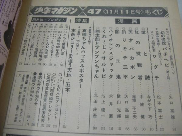 週刊少年マガジン NO.47 1973年11月11日号 天知真理 表紙+巻頭グラビア バチヘビ/矢口高雄 ワダチ/松本零士 大激戦'73大賞レース(沢田研二、天知真理、五木ひろし、ぴんから兄弟、小柳ルミ子、チェリッシュ、ガロ、金井克子、由紀さおり)