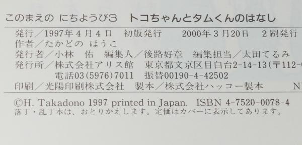 • 解説 このまえのにちようび3 トコちゃんとタムくんのはなし アリス館 2000年3月2刷 A5判変型ハードカバー.