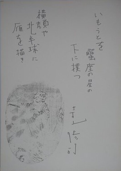 色紙 「いもうとを蟹座の星の下に撲つ 横顔や北半球に雁を描く」 寺山修司