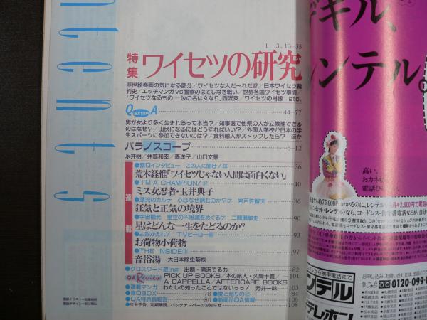 • 解説 浮世絵春画の気になる部分/日本ワイセツ裁判史/エッチマンガVS警察/荒木経惟インタビュー/<神経症ルポ:狂気と正気の境界>岩戸佐智夫/TVヒーロー「お荷物小荷物」/音浴湯(大日本除虫菊(株)) 小ヤケ・スレ・ヨレ 表紙少ヨゴレ クロスワードパズル黒鉛筆書き込み