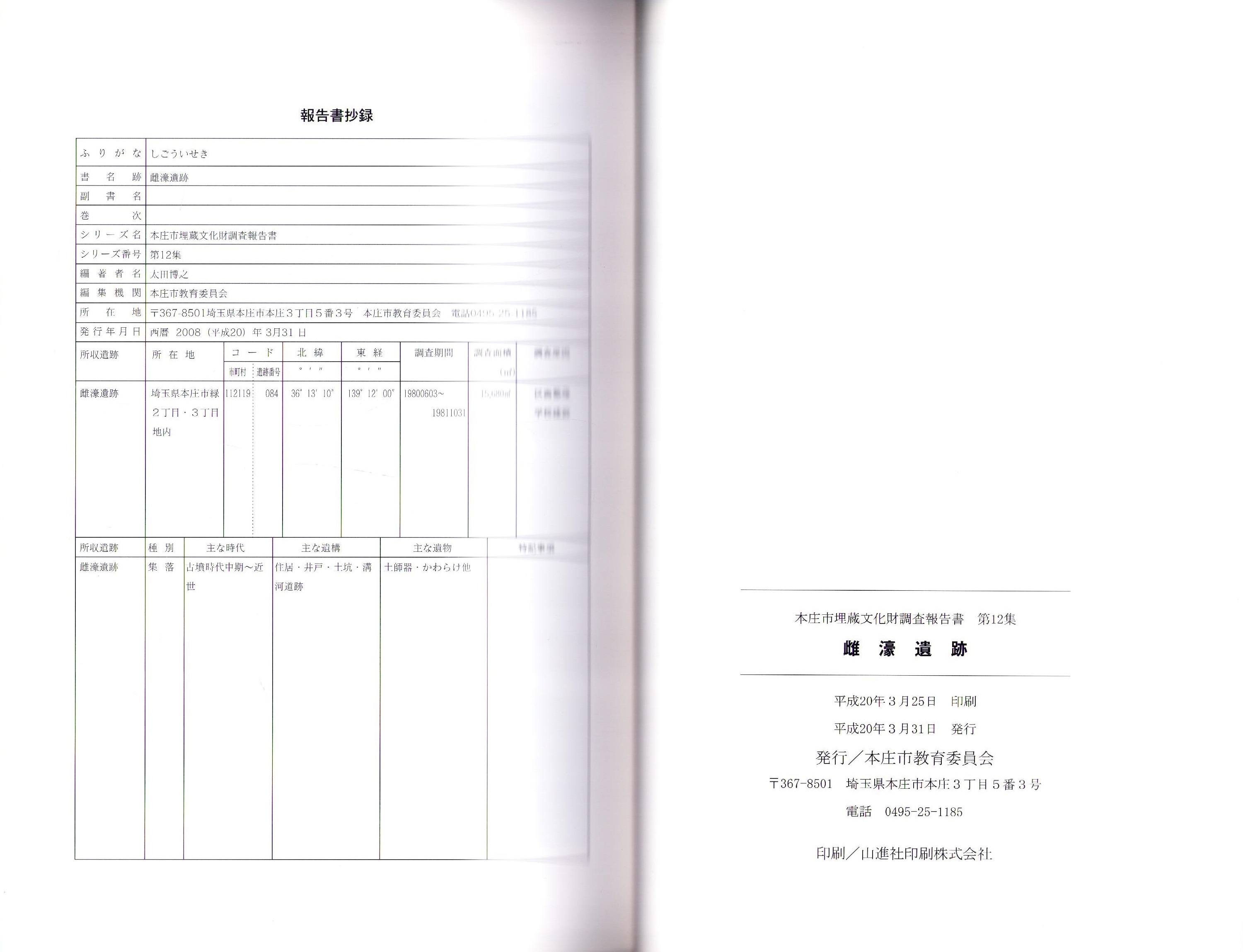 雌濠遺跡 -本庄市埋蔵文化財調査報告書 第12集-(埼玉県)