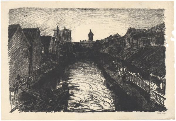 • 解説 石版29×44.5cmed.501枚裏打 薄いヤケ マージン虫穴・少シミ *石版画家、織田一麿の代表的な版画集。東京風景と並び20図を制作。 大阪特有の美観を描写し後年に伝える為に、より実感的に描かれている。