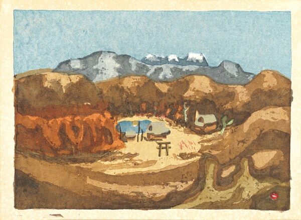 • 解説 木版26×36cmed.100共タトウ1枚Original Sleeveシミ  山と渓谷社 頒布作品 版画集「山湖」より 自摺 裏面に「頒布作 畦地梅太郎」の文字印
