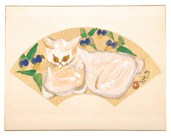 • 解説 水彩 紙31.7x40.8cm(シートサイズ)共帙 1枚Original Folder 少ヤケ 扇面を色紙に貼付