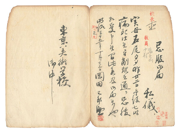• 解説 毛筆24.5x33.6cm(シートサイズ)1通少ヤケ 綴ジ穴 端部欠ケ 角少折レ 東京美術学校宛 忌服届