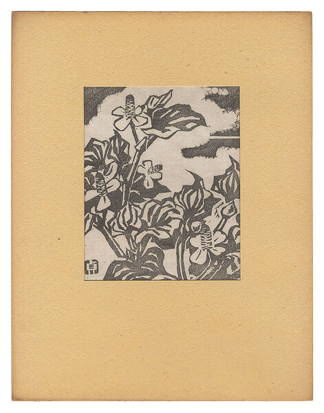 • 解説 木版 17.2x13.9cm(窓サイズ)/34.5x26.8cm(台紙サイズ)ed.1001枚少点シミ ※台紙貼付のため窓から確認できる範囲のみ 「きつつき版画集 第2号」より 自刻自摺 台紙(裏面に題箋の貼付。ヤケ有)に貼付