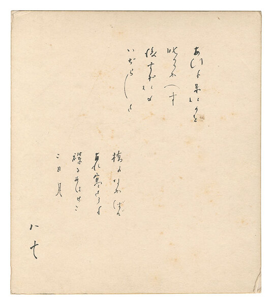 • 解説 毛筆 紙本 27.3x24.2cm(シートサイズ)1枚シミ ヤケ キズ 角傷ミ 「あひに来たのを 叱ってかへす 後すがたの いぢらしさ」 「橋のなかばで あれ寒さうな 襟をあはせた 二日月」  ※西條八十(1892-1970/東京都出身):詩人、作詞家、フランス文学者。早稲田大学在学中、日夏耿之介らと『仮面』を刊行し、三木露風の『未来』の同人となる。1918年鈴木三重吉の『赤い鳥』創刊に参加し、童謡「かなりあ」を発表。以後、北原白秋、野口雨情らと共に大正期を代表する童謡詩人として活躍した。また、歌謡曲の作詞家として「東京行進曲」、「青い山脈」、「蘇州夜曲」、「東京音頭」、「サーカスの唄」などの流行歌や軍歌まで幅広い分野を手掛けた。戦後はアルチュール・ランボーの研究にも打ち込んでいる。日本詩人クラブ初代理事長、日本音楽著作権協会会長などを歴任。