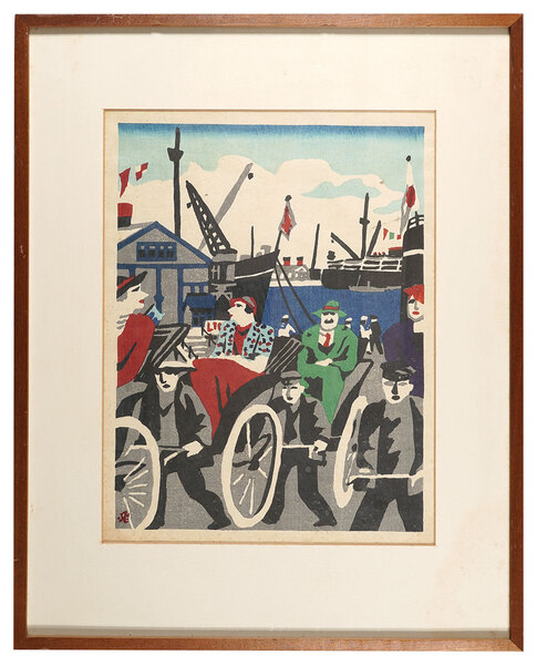 • 解説 木版 33.3x24.5cm(イメージサイズ) / 52.1x40.7cm(額サイズ)額装 1面Frame マージン少シミ・少ヤケ ※額裏密閉のため表面から確認できる範囲のみ  加藤版
