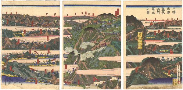 • 解説 Woodblock Print大判3枚続摺良 虫穴補修 少シミ 傷ミ 下部欠損補修 ※後三年の役の図