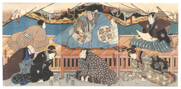 • 解説 Woodblock Print大判3枚続摺良 トリミング 裏打 少傷ミ 端部少切レ・折レ ※3枚が繋がっています 左から 伯父重兵衛/中村源之助 天日坊/中村歌右衛門 妹お房/藤川花友 むこ佐七/市村羽左衛門 青砥藤綱/中村歌右衛門 妹小糸/坂東しうか 伊皿子七郎/関三十郎