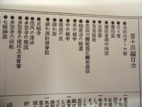 • 著者 「目次」より:・隅田川すゝみ船 ・養浩園 ・藤田東湖の幽室 ・長春園 ・有馬温泉 ・鐘か淵 ・正福寺 ・多聞寺の縁起 ・隅田川の渡船 ・隅田川の夜漁 ・都鳥 ほか