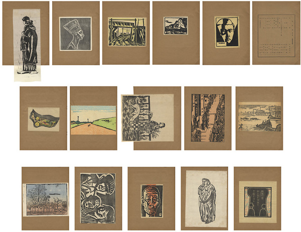 • 解説 木版15枚 松下義雄:自画像/武藤完一:耶馬溪/吉田正三:ガード/水船六洲:ツタンカーメン王の義母ネフルチニ像/新田穣:女習作/清水正博:都会風景No.3/鈴木健夫:下田河口/武藤六郎:花売娘と犬/蓬田兵エ門:風景/柴秀夫:足について/大久保一:相生きの壷/吉原正道:西域の女/藤牧義夫:島のぢいさん/菊池善二郎:家族/武田由平:秋 小野忠重構成:鐵(版画編輯試作) 作品:藤牧/武藤/柴/小野/児童作品他 表紙欠