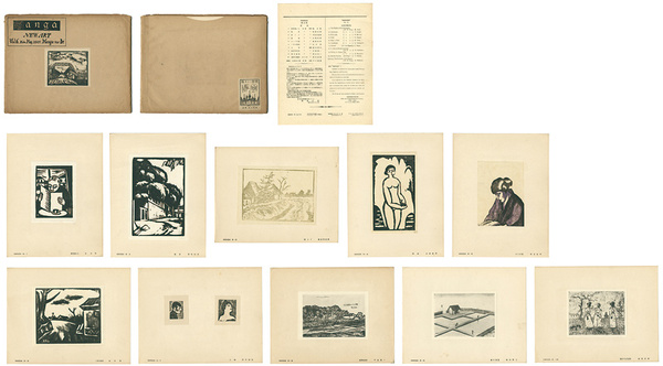 • 解説 全10枚 旭正秀:新聞読む人(木版)/稲垣知雄:風景(木版)/森谷利喜雄:河べり(木版)/永瀬義郎:裸婦(木版)/諏訪兼紀:ポーズの後(木版)/山口進:二月の風景(木版)/藤田嗣治:人物(複製)/平塚運一:駒澤村風景(複製)/森山収二(北澤収治):春日清遊(複製)/西田武雄:散歩する看護婦(複製) /平川清蔵:表紙絵「水源地の裏」(木版) 作品は台紙に貼付 袋(傷ミ)