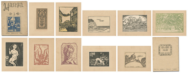 • 解説 木版 全10枚 澁江終吉:無題/前川千帆:別府明礬温泉/平塚運一:北海道のある海岸/川上澄生:アラスカの雪景/萬鉄五郎:ヴェールの人/大月文一:ヂキタリス/塚本しげる:反逆者/山口進:八月の午後/深沢索一:去年切り開いた道/諏訪兼紀:加茂の杜 限300 カバー木版装(シミ、少傷ミ)