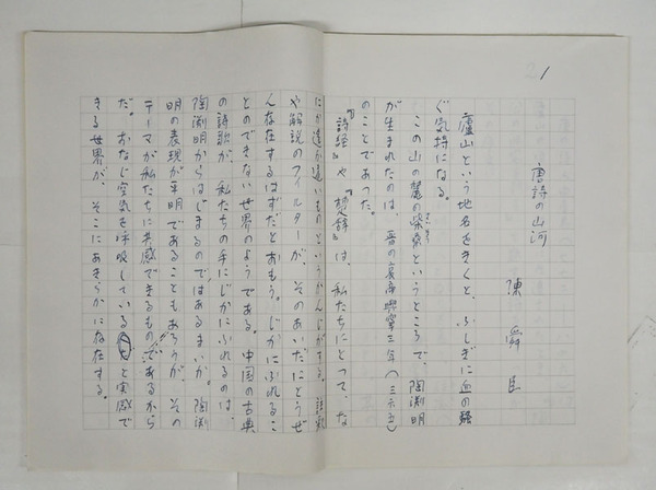 陳舜臣草稿 『唐詩の山河』 ペン書四百字詰51枚完 「…この山の麓の柴桑というところで、陶淵明が生まれ…」
