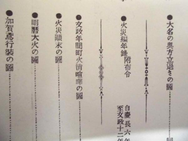 • 著者 「目次」より:・火災編年録 附布令 自慶長六年 至文政十二年