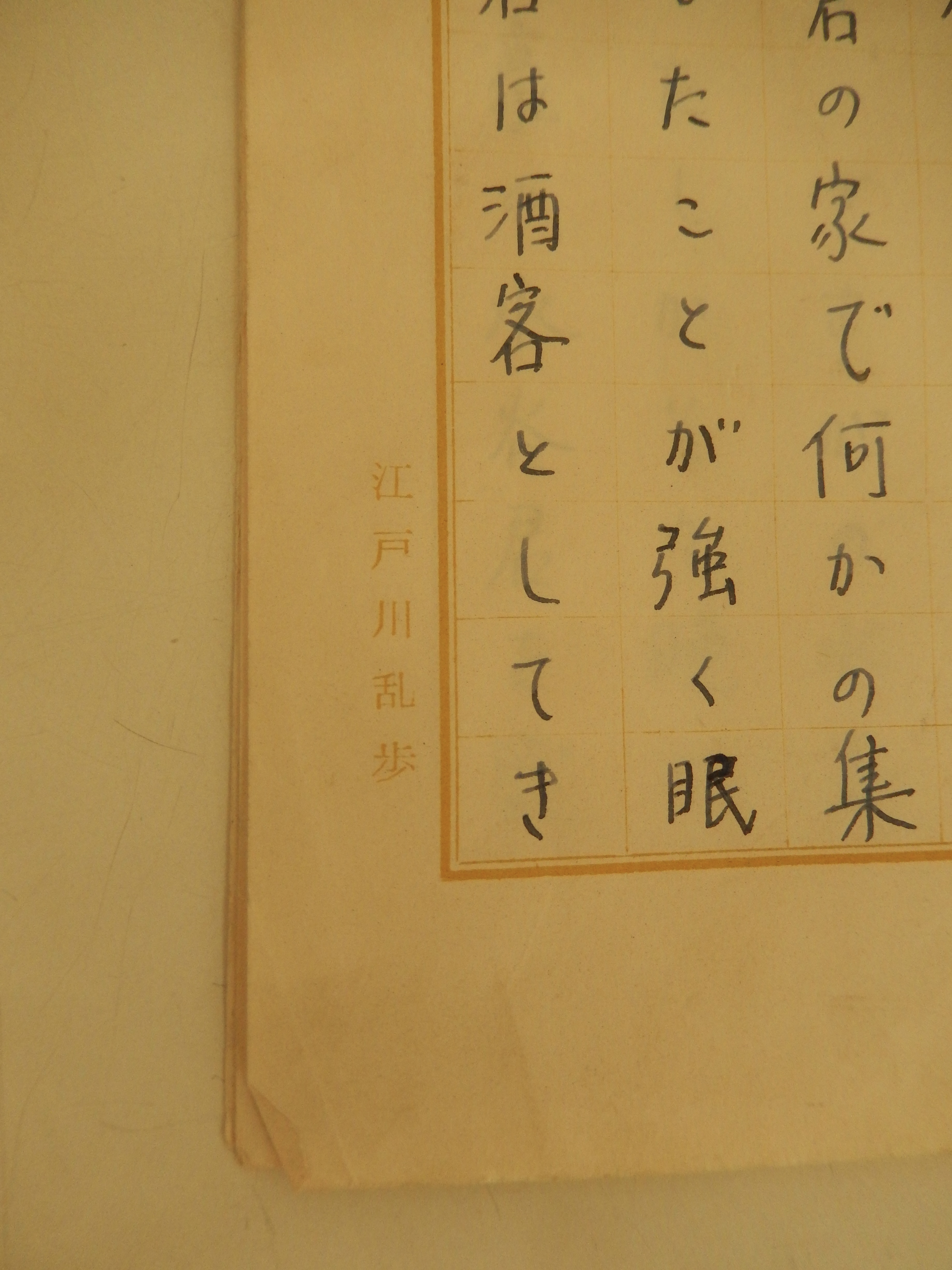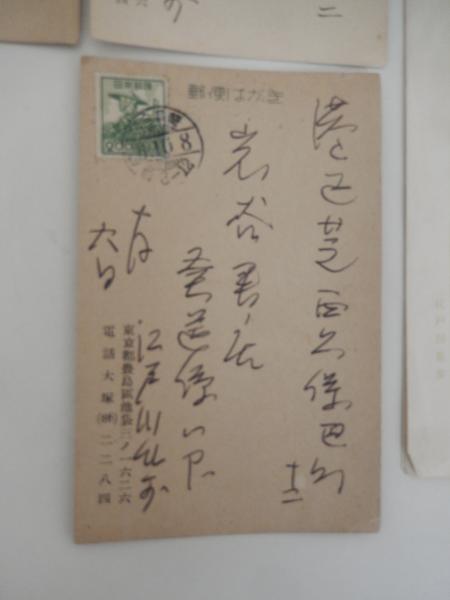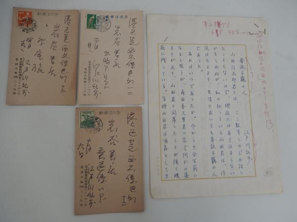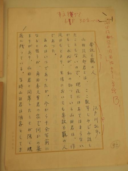 江戸川乱歩自筆資料3点岩谷書店 江戸川乱歩昭和27年28年+江戸川乱歩代筆原稿江戸川乱歩自筆葉書3通、江戸川乱歩代筆原稿(江戸川乱歩原稿用紙)夲放不羈の人 江戸川乱歩専用原稿用紙200字5枚完結 山田風太郎君とは〜角田喜久雄君の家で〜水谷君は豪のもので〜 推理作家仲間との交流やエピソードを描いた草稿。岩谷書店編集者旧蔵品