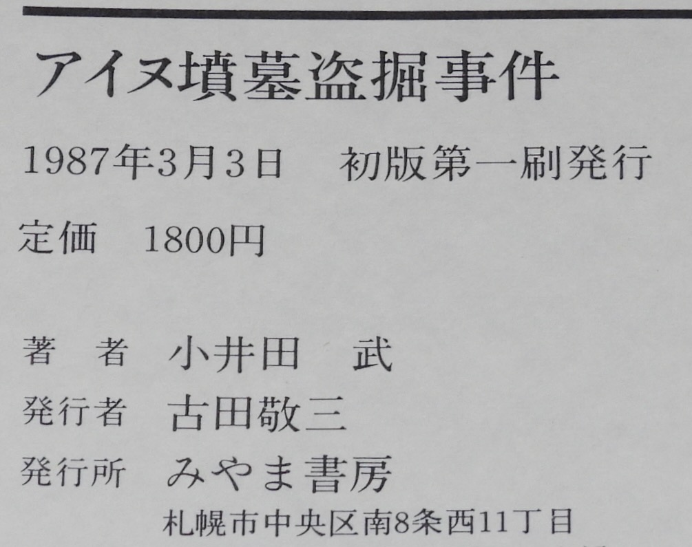 • 解説 アイヌ墳墓盗掘事件 小井田武 みやま書房 1987年3月初版 四六判ハードカバー帯付.