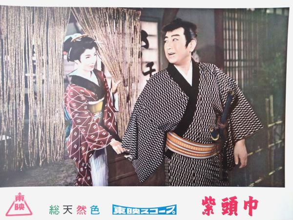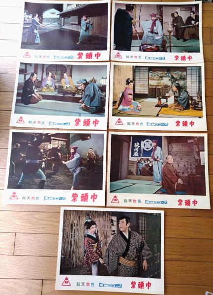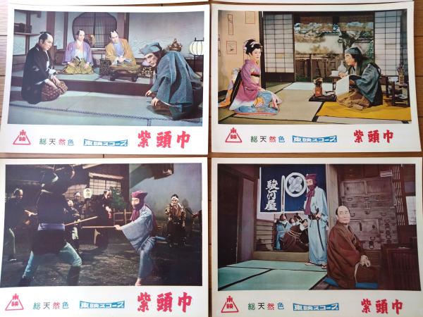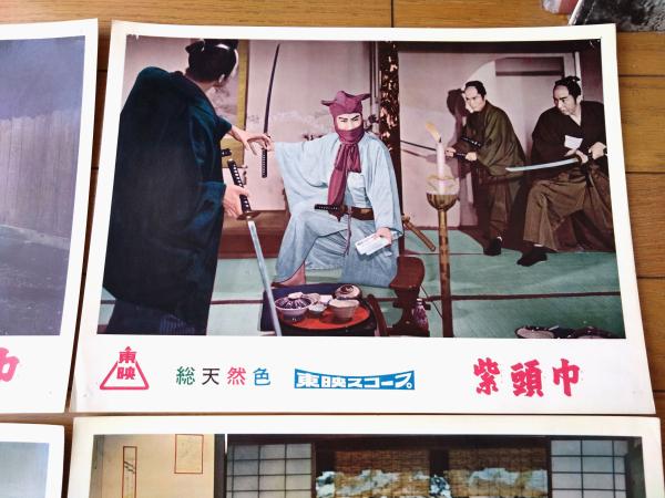 【総天然色 紫頭巾(片岡千恵蔵・主演/大西秀明・監督)・ロビーカード7枚組(B4サイズ/若干大きめ)】東映スコープ/昭和33年