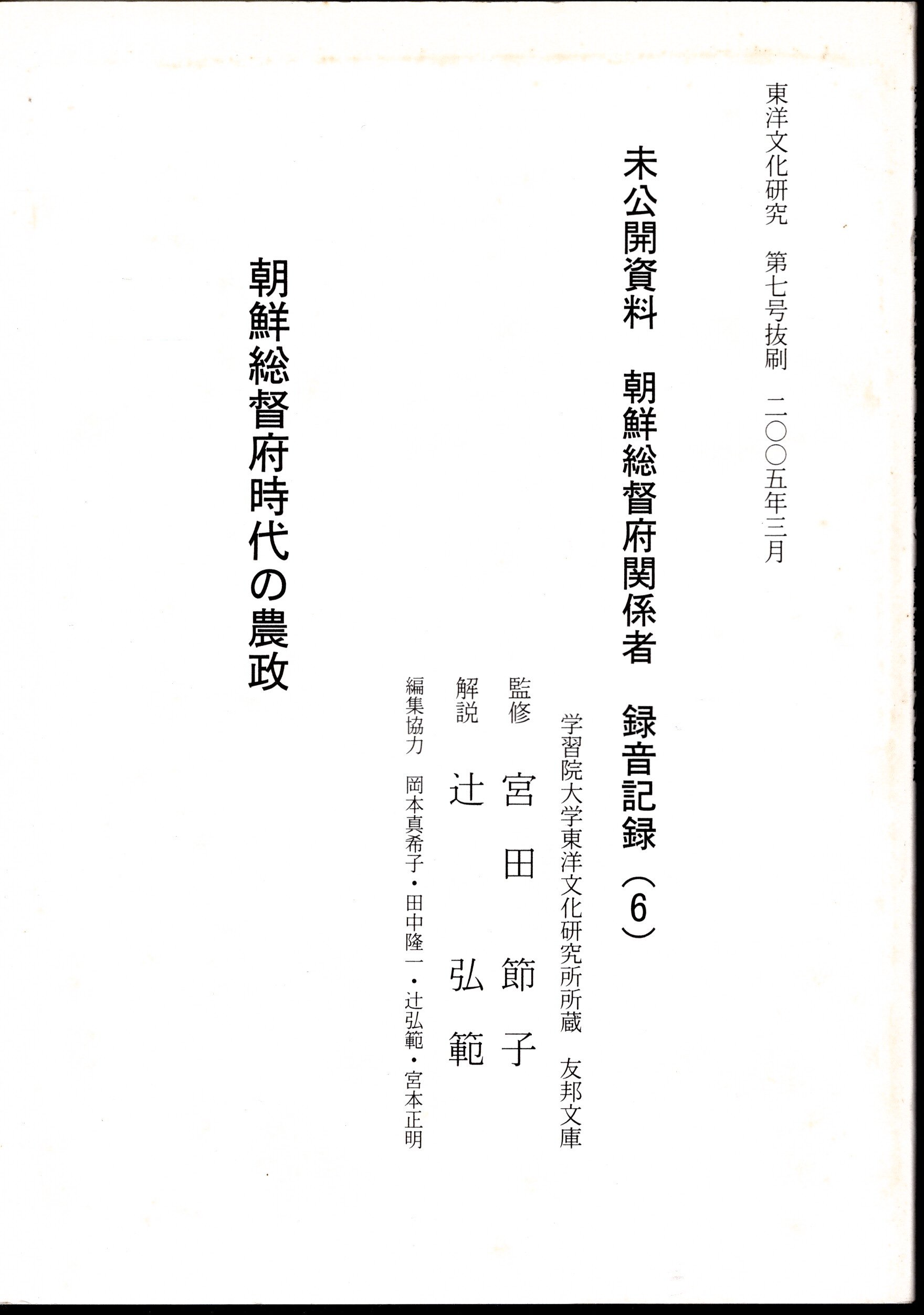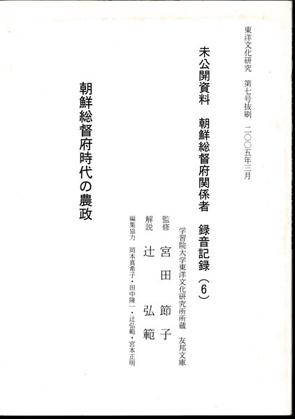 東洋文化研究所 第七号抜刷 未公開資料 朝鮮総督府関係者 録音記録(6) 朝鮮総督府時代の農政