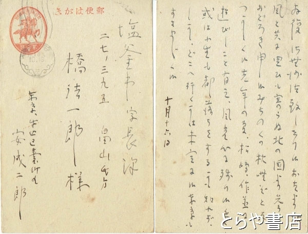 安成二郎自筆葉書