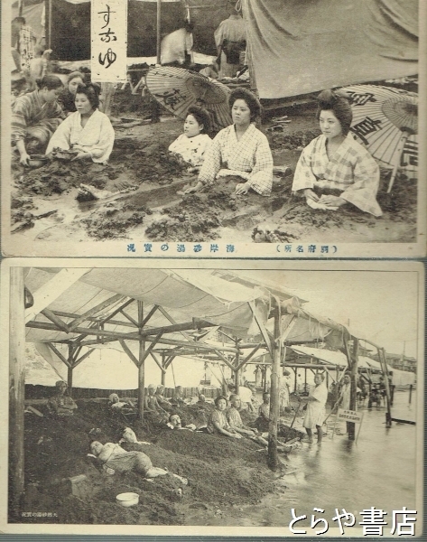 絵葉書 別府温泉名勝 天然砂湯の実況2枚を付す(白黒版)