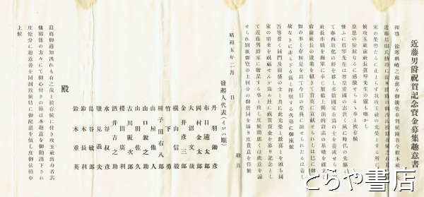 近藤男爵祝賀記念資金募集趣意書 趣意書・発起人名簿(600名)