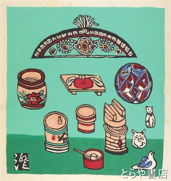川上澄生木版画 失題 猫・鳩・鞠・おひつ・ひしゃく・酒樽・まな板