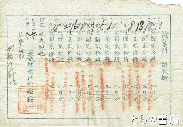 茨城県水戸中学校授業料領収證