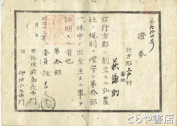 • 解説 行方郡に創立した弘農社の證券 11×16センチ 両面刷り