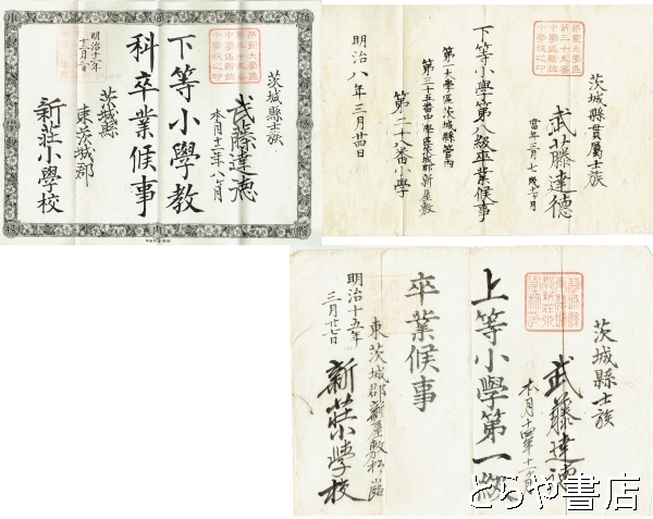 茨城県東茨城郡新荘小学校卒業証書 下等小学校第八級(明治8年)下等小学校(明治12年)上等小学校(明治15年)