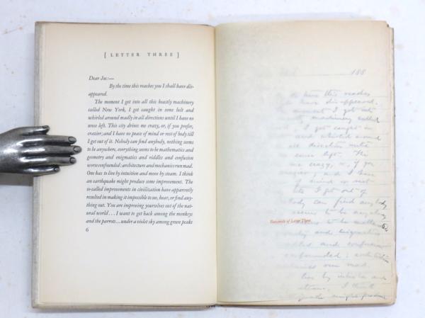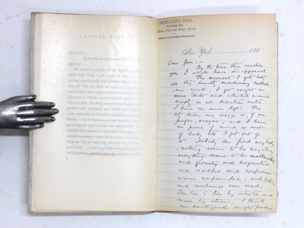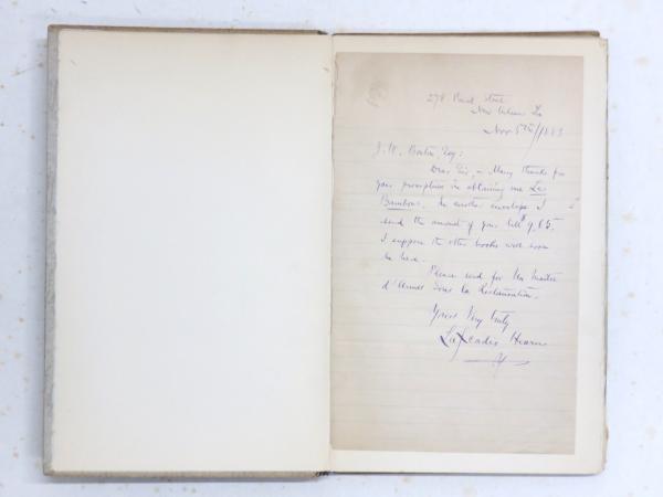 • 解説 サンフランシスコ: The Westgate Press 1930年 初版 限定350部 ハーン自筆署名入書簡1葉つき(ニューヨークの書店主J.W.ボートン宛 1883年11月5日 青罫線入り紙 20.5x12.8cm) 背クロース、厚紙装 図版 全体的に少ヤケ、少綴じ緩み ハーン書簡綴じ外れ 前見返しに書店ラベル Limited 350 copies printed in May,1930,by The Grabhorn Press. Hearn’s original autograph letter tipped in at front flyleaf (A letter to J.W.Bowton,dated Nov.5th 1883,written on a light blue ruled paper. 20.5x12.8cm),detached. Navy patterned light brown cloth spine with paper title label,sunned. Gray patterned light gray paper covered boards. Boards,edges and e.ps.sl.foxing. Binding sl.loosened. A bookshop label pasted on frontt e.p.