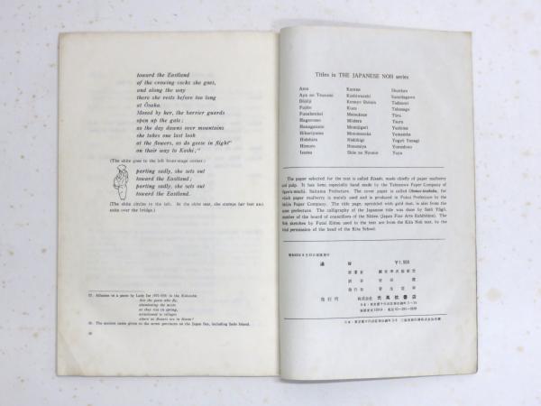 • 解説 昭和42年8月15日初版発行 和装本 全体的に少ヤケ 表紙角に折れた跡 附・前所有者のメモ「L.Hearnは、この「湯谷」を翻訳しようと試みた 大谷正信書簡中に、みられる…1900年4月30日…・「ユヤ」は註が多くて、英国の読者は読んでくれないだろう。」First edition. Soft cover,gray Japanese paper covers,Japanese paper (Kizuki) pages. Japanese binding. A color photograph of Noh pasted on a page facing to p.1. b/w illus.(Noh sketches) in text. Wholly somewhat foxing. Lower corner of front cover folded.