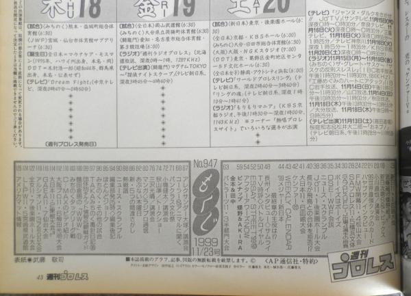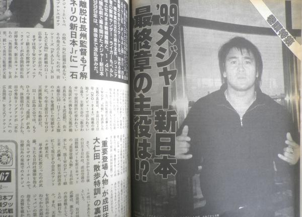 新日11・1広島大会 武藤組VS蝶野組ほか 小川直也/講演会 '99世界最強タッグのカード ハヤブサ/インタビュー 長与が飛鳥との合体を拒否!? 長州インタビュー ピンナップ/蝶野&AKIRA・金本&田中 アレクサンダー大塚/講演会 小橋建太/講演会 秋山準/トークショー 三沢光晴/講演会 他