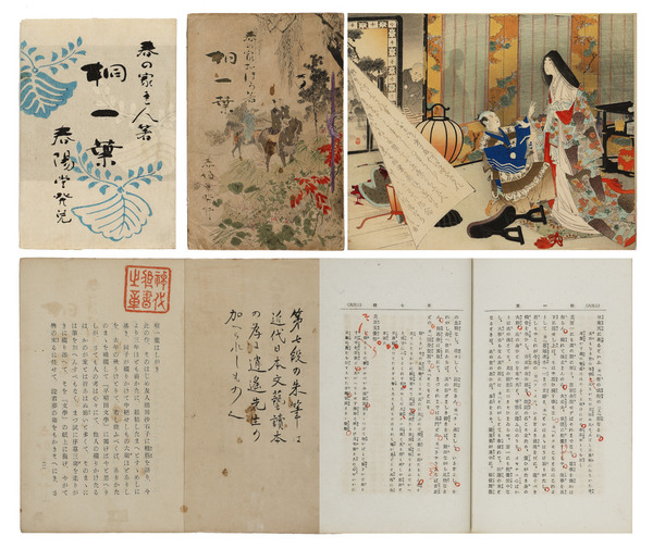 • 解説 神代種亮旧蔵書 神代蔵書印有 見開きに由来書き「第七段の朱筆は近代日本文藝読本の為に逍遥先生の加へられしもの也」 坪内逍遥朱筆校正 鈴木華邨木版口絵 初版 袋付(少傷み) シミ  地に朱で題名書入れ #95号目録初版本