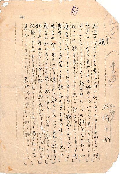 • 解説 『顔』 毛筆 罫紙1枚完 破れ 「花道の灯ぱつとともれり一斉に灯にふりむきしあかきその顔」等11首。(種別)短歌 #八木書店近代自筆物/1.草稿類 #95号近代文学特輯 95604127 ※自筆物につきましては、毎月25日前後に新蒐品を追加しております。PDF形式で御覧になりたい方は https://company.books-yagi.co.jp/archives/news/10928 を参照ください。