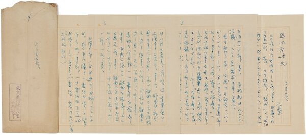 • 解説 島田青峰宛 ペン書 便箋2枚55行 封筒付 大11・6・26(消印) 新聞小説の売り込み。「私は『受難の親鸞』の次ぎに『晩年の親鸞』を書くつもりで居りますが、それは凡そ新聞では七八十回のものになると思ひます。それをどうか大兄の推薦によつて『国民』紙上に御掲載願はれますまいか」。(発信地)巣鴨染井(受信地)國民新聞社 #八木書店近代自筆物/2.書簡類 #八木古書2026年2月新蒐 95313010 ※自筆物につきましては、毎月25日前後に新蒐品を追加しております。PDF形式で御覧になりたい方は https://company.books-yagi.co.jp/archives/news/10928 を参照ください。95号目録(R8.1)以後の追加は「#八木古書2026」で検索できます。